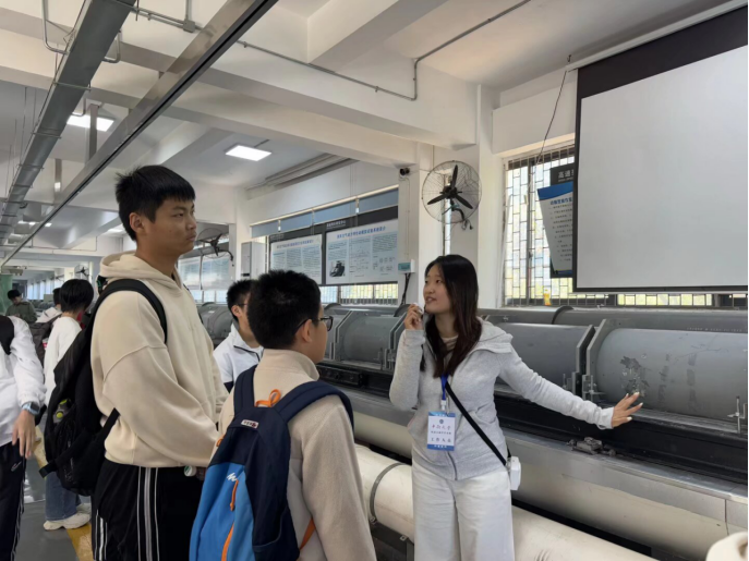 参观过程中,师生首先进入气动实验区域。赵紫怡结合实验展示装置,讲解高速列车车头外形设计与空气阻力之间的关系,介绍列车在高速运行、交会及隧道通过等工况下所面临的空气动力学问题,引导员工理解流线型设计在提升运行效率与稳定性方面的作用。