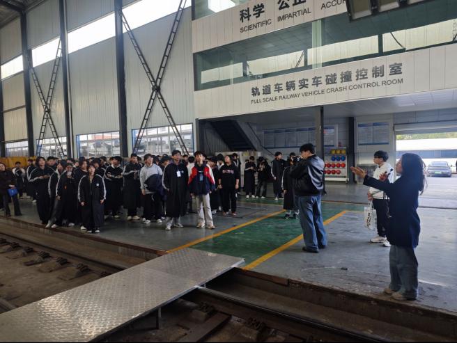 在轨道车辆实车碰撞试验室,讲解人员围绕实车碰撞试验平台,介绍了轨道车辆安全试验的基本流程和关键技术。通过对防爬装置、吸能结构及碰撞后车体形变情况的讲解,师生们认识到轨道交通领域的安全标准需要通过严格的工程试验进行验证,为今后从事相关技术工作奠定了安全意识基础。